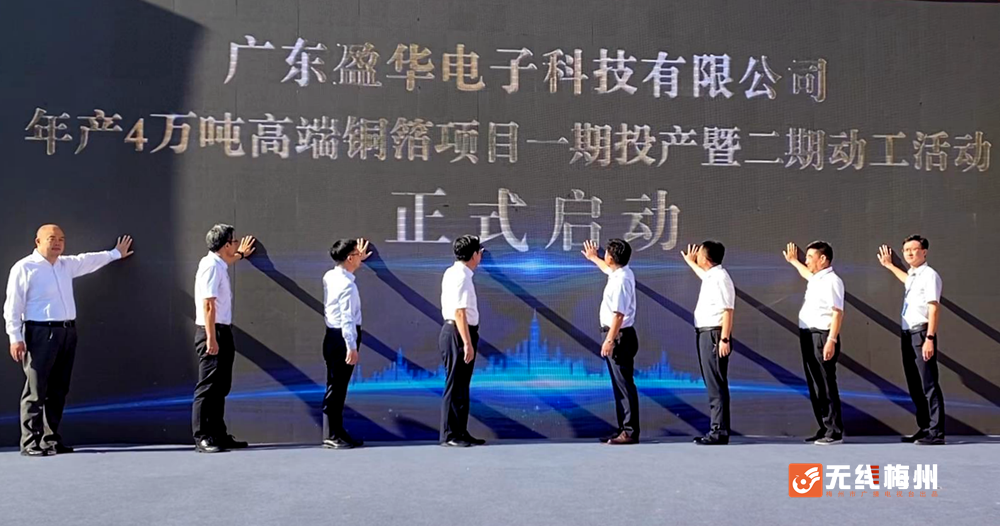 市委副書記、市長王暉;廣東盈華電子科技有限公司董事長李劍明;中國農業銀行股份有限公司廣東省分行副行長王新林;市委常委、副市長,梅江區委書記陳金鑾;市政府副市長蔣鯤;中國電子材料行業協會電子銅箔材料分會秘書長冷大光;深圳盛屯集團有限公司董事長、總裁陳東;廣東盈華電子科技有限公司總經理李遠泰參加活動。活動由梅江區委副書記、區長鐘秀堂主持。